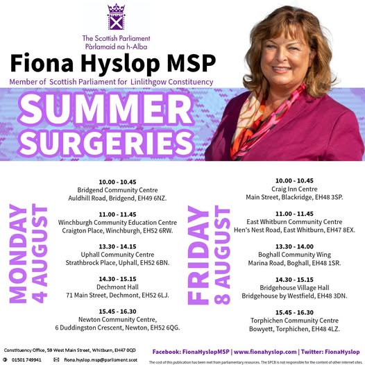 The surgeries took place on Monday 4th and Friday 8th August. Fiona visited and conducted surgeries in Bridgend, Winchburgh, Uphall, Dechmont, Newton, Blackridge, East Whitburn, Boghall, Bridgehouse/Westfield and Torphichen in just two days.